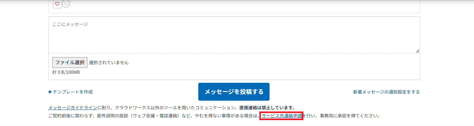 サービス外連絡申請とは、クラウドワークス外での直接連絡が必要な場合に、事務局に申請する機能です。