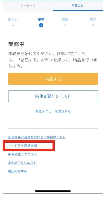 ただし、やむを得ない事情により、契約前や契約後にウェブ会議またはオンラインでの打ち合わせをおこなったり、連絡先(メールアドレスや電話番号など)を交換したい場合には、「サービス外連絡申請」をおこない、メッセージ上で連絡先を交換することも可能です。